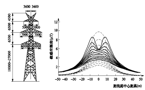 應(yīng)注意到,線路周圍空間的工頻磁感應(yīng)強(qiáng)度與線路電流成正比。隨著單回線路輸電容量的增大,500kV同塔多回輸電線路已采用分裂數(shù)更多、截面更大的導(dǎo)線(如6×630mm2導(dǎo)線),每回線路電流可高達(dá)2000~3000A。此時(shí),線路下方工頻磁感應(yīng)強(qiáng)度*大值可能高達(dá)20~30μT。但即使對多分裂、大截面、走廊內(nèi)線路高度密集的同塔多回路輸電線路,其下方的工頻磁感應(yīng)強(qiáng)度*大值仍遠(yuǎn)低于環(huán)境影響評價(jià)標(biāo)準(zhǔn)限值(100μT)。由圖1、圖2計(jì)算實(shí)例可見,在距線路中心50~100m以上距離處,來自電力線路的工頻磁場水平已與當(dāng)?shù)厣瞽h(huán)境中的背景水平相當(dāng)。