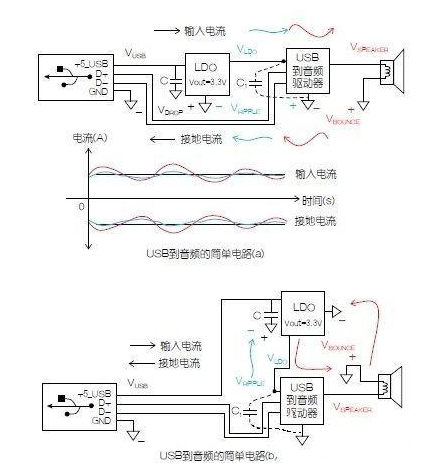 為了證明該理論,讓我們來(lái)看一個(gè)簡(jiǎn)單的電路并考慮所示的連接。該基本電路包括三個(gè)要素,一個(gè)低壓差(LDO)線性調(diào)節(jié)器,一個(gè)微處理USB 數(shù)據(jù)線接到音頻驅(qū)動(dòng)器,和一個(gè)揚(yáng)聲器,所有這些都由一個(gè)連接到某個(gè)計(jì)算主機(jī)的USB插頭供電。在本例中,USB到音頻驅(qū)動(dòng)器必須用3.3V供電。由于揚(yáng)聲器采用音頻驅(qū)動(dòng)器的輸出供電,所以音頻輸入驅(qū)動(dòng)器需要+3.3V LDO,其由USB連接器供電(+5V),這似乎可以得到一個(gè)顯而易見(jiàn)的結(jié)論,即可將它們放置在圖1(a)原理圖所示的位置。但是,在這種框架下,驅(qū)動(dòng)揚(yáng)聲器工作的電流在返回到電流源驅(qū)動(dòng)器時(shí)會(huì)產(chǎn)生一個(gè)電壓反彈,該電壓反彈會(huì)反過(guò)來(lái)作用于LDO并*終影響到USB 連接器。在本例中,把USB數(shù)據(jù)轉(zhuǎn)換為音樂(lè)的基準(zhǔn)電壓會(huì)以音樂(lè)播放的速率反彈。由于揚(yáng)聲器電感所產(chǎn)生的相移會(huì)增大誤差,這將和由于電流提升產(chǎn)生的高音量混合在一起。電壓反彈也將導(dǎo)致紋波出現(xiàn),這將降低揚(yáng)聲器發(fā)出的音質(zhì)。
