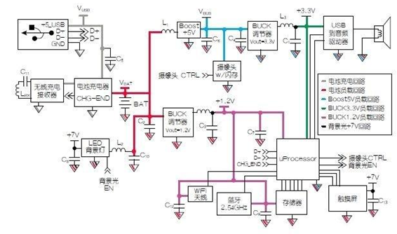在上面的應(yīng)用案例中,只有兩個(gè)電流回路。現(xiàn)在,我們換一個(gè)更復(fù)雜的例子。下面考慮的是一個(gè)較為復(fù)雜的平板電腦系統(tǒng)。在本例中,平板電腦包括背光、觸屏、攝像頭、充電系統(tǒng)(USB和無(wú)線)、藍(lán)牙、WiFi、音頻輸出(揚(yáng)聲器,耳機(jī))、以及用于存儲(chǔ)數(shù)據(jù)的存儲(chǔ)器。當(dāng)然,這些應(yīng)用的大部分都需要不同電壓的電源軌以便更好地工作。如圖2所示,該系統(tǒng)具有五個(gè)電源軌和兩種給電池充電的方法,這意味著至少會(huì)有五個(gè)電流回路。但相比直流電源,以及相關(guān)的各條電流路徑,實(shí)際應(yīng)用中有更多需要考慮的方面。電路中有多個(gè)開(kāi)關(guān)穩(wěn)壓器,廣播和接收天線系統(tǒng),所有這些都需要使用微處理器來(lái)協(xié)調(diào)和控制。展示的與電源和它們供電的模塊相關(guān)聯(lián)的電源路徑和GND路徑,有助于將電源和負(fù)載電流評(píng)估進(jìn)行匯總,從而實(shí)現(xiàn)以下目的: